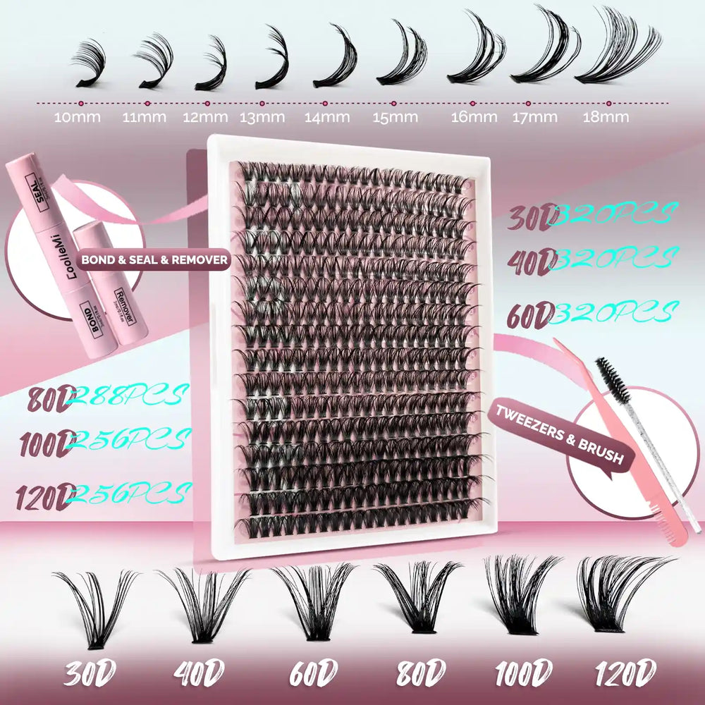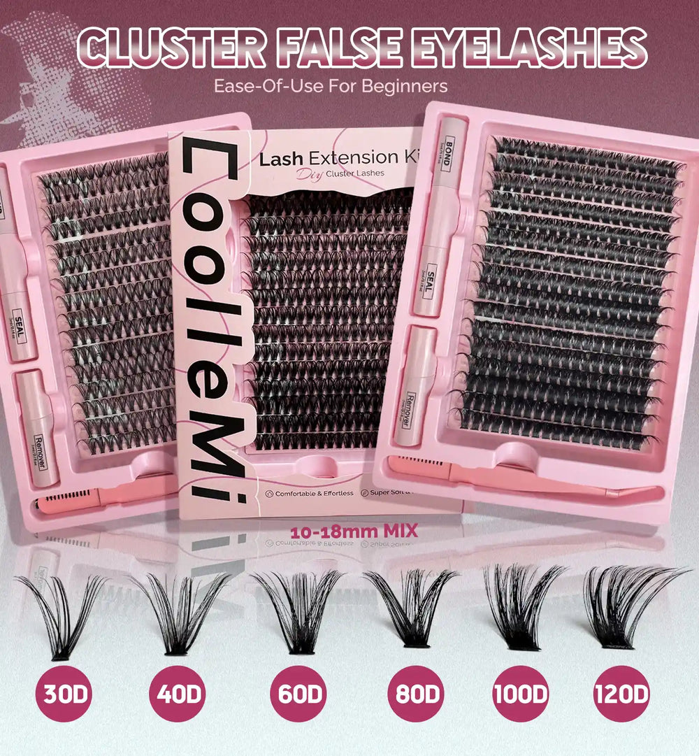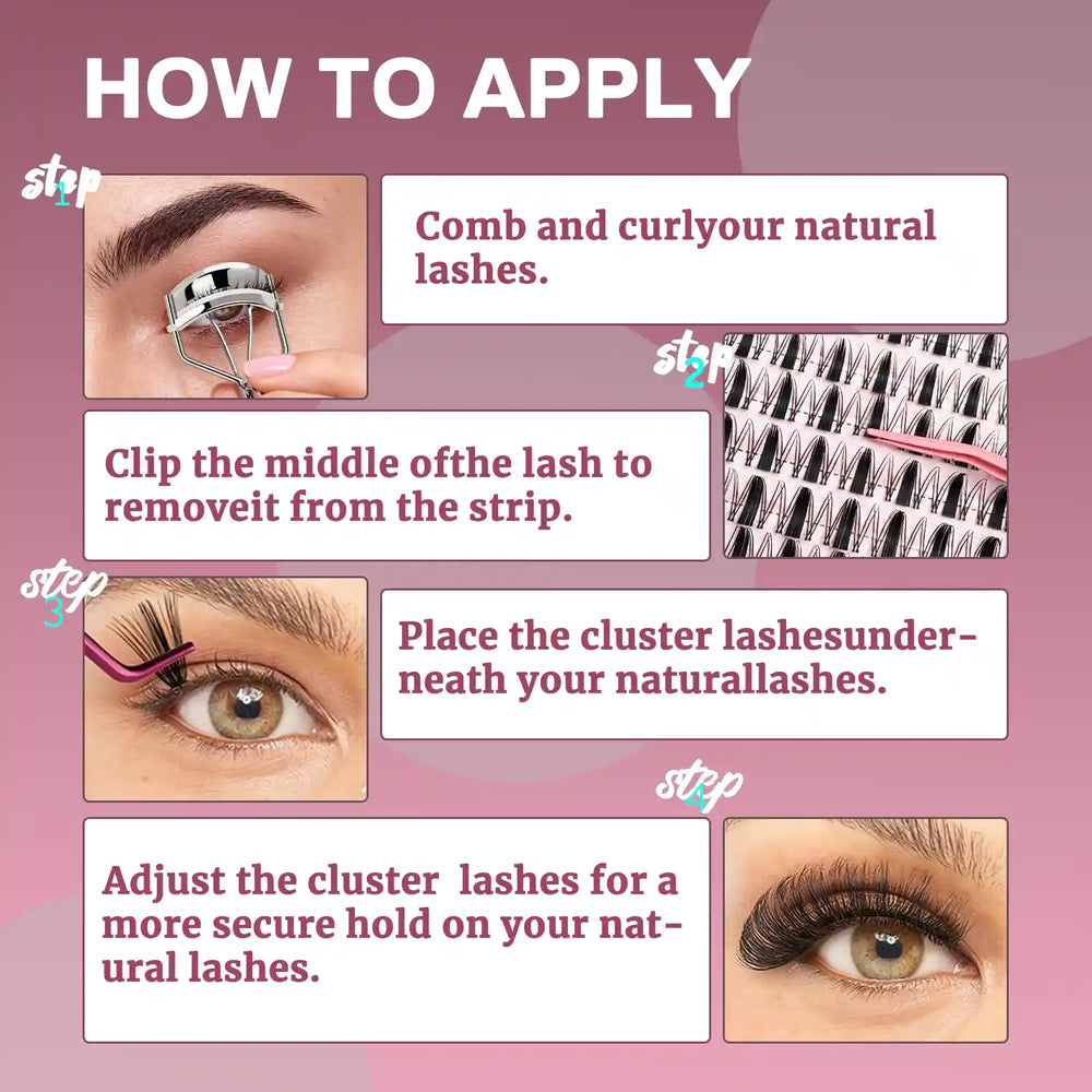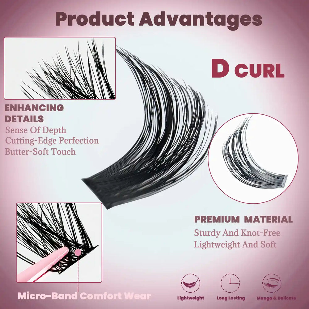 Lash Clusters: Enhance your look with thick, wispy D curl lashes.